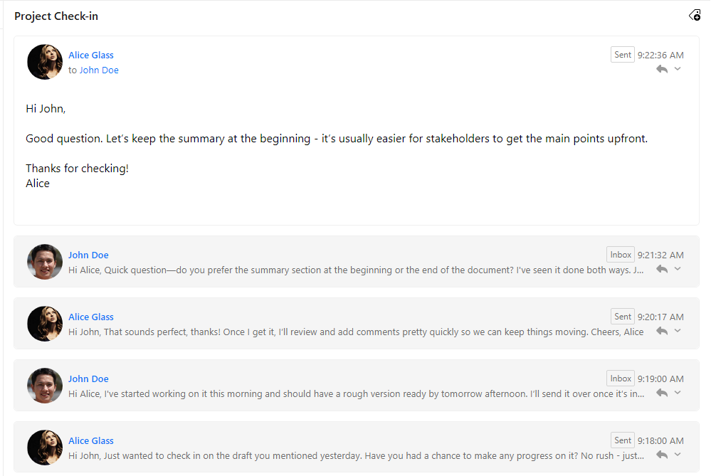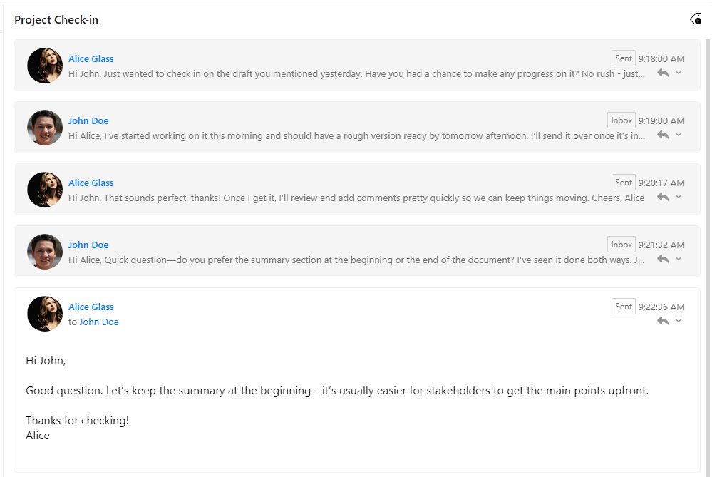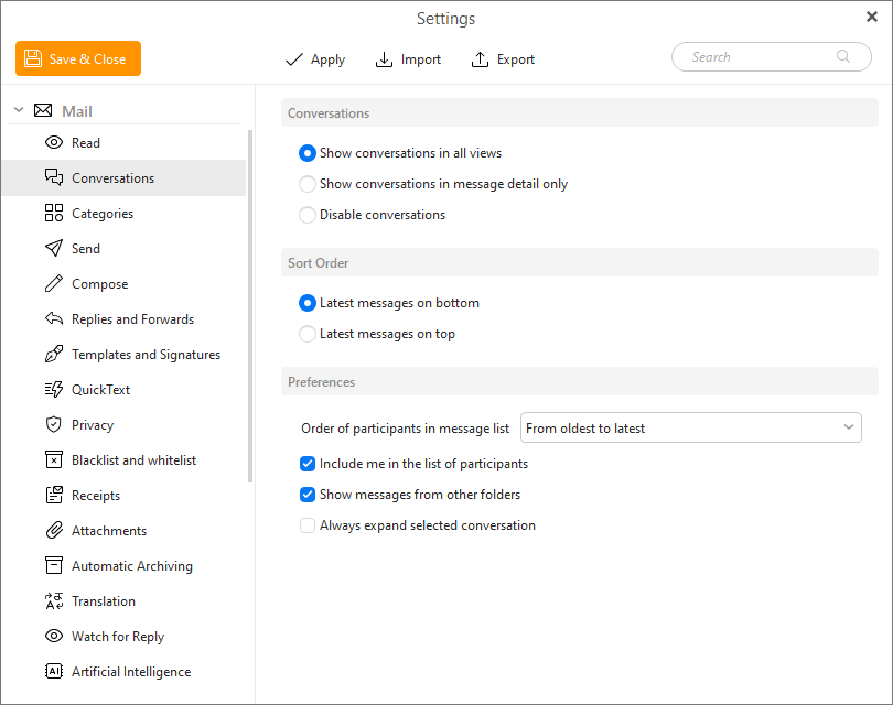 When enabled, Conversations group all related emails into a single, organized view. This makes it easy to review the full discussion, follow the flow of communication across multiple participants, and ensure nothing gets overlooked. By keeping everything together, it reduces inbox clutter and saves you time - so that you can focus on moving conversations forward instead of searching for them.