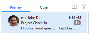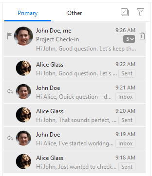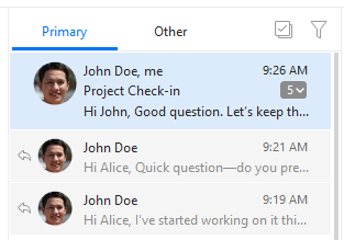 The Threads view adds the option to expand a conversation within the message list. This gives you a quick overview of the separate emails linked in this conversation, which can be especially useful when you need to view a single specific message or locate an attachment from a specific reply, etc. It’s available to all users with a paid license.