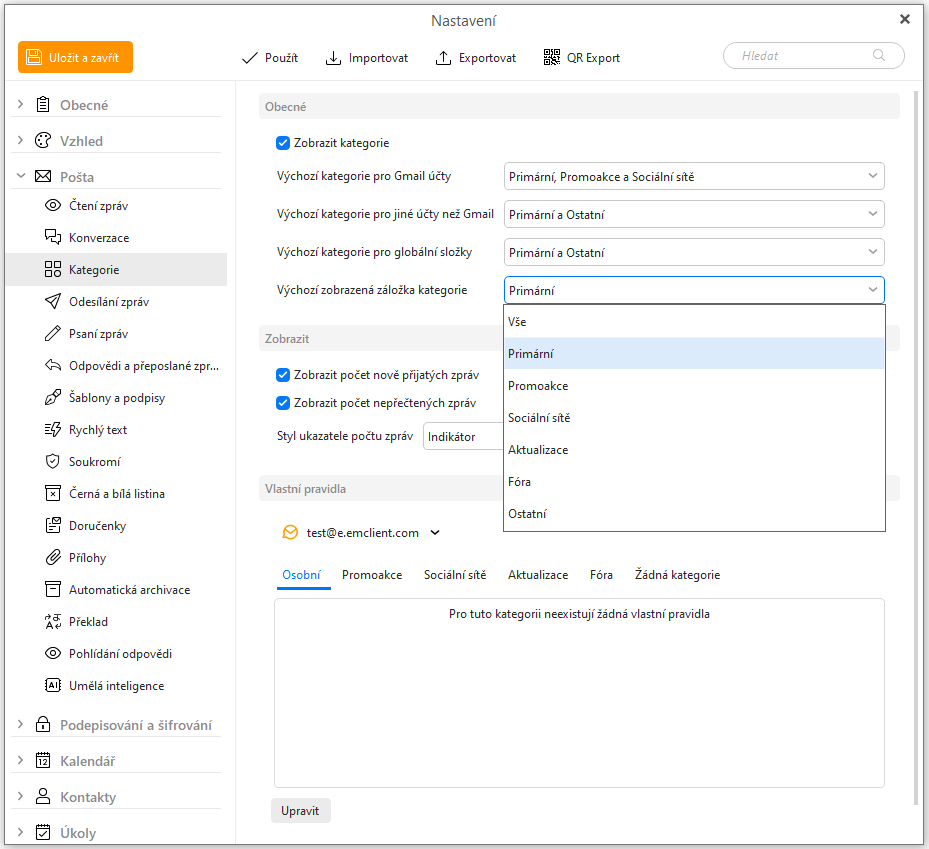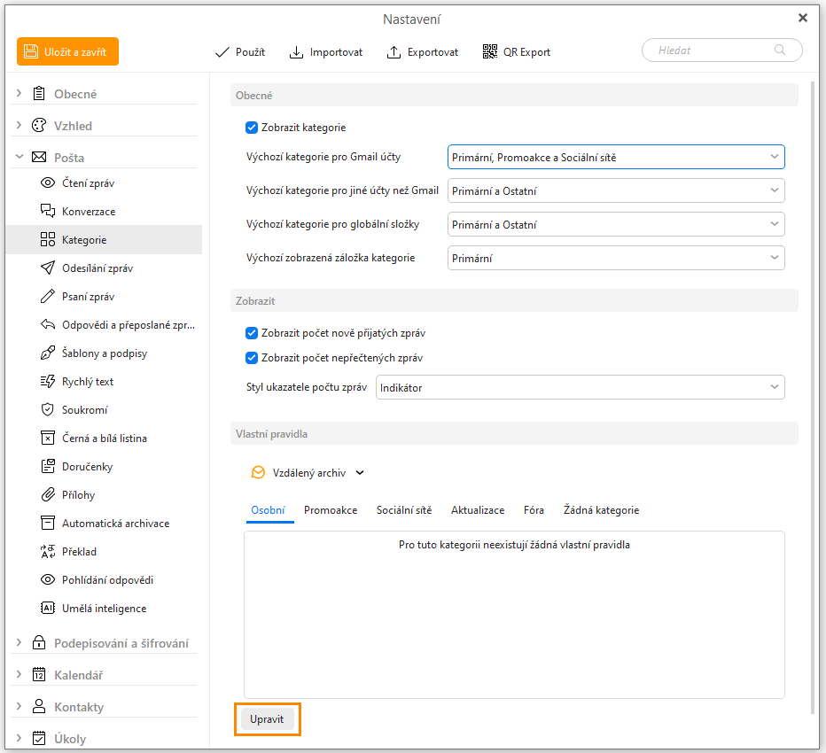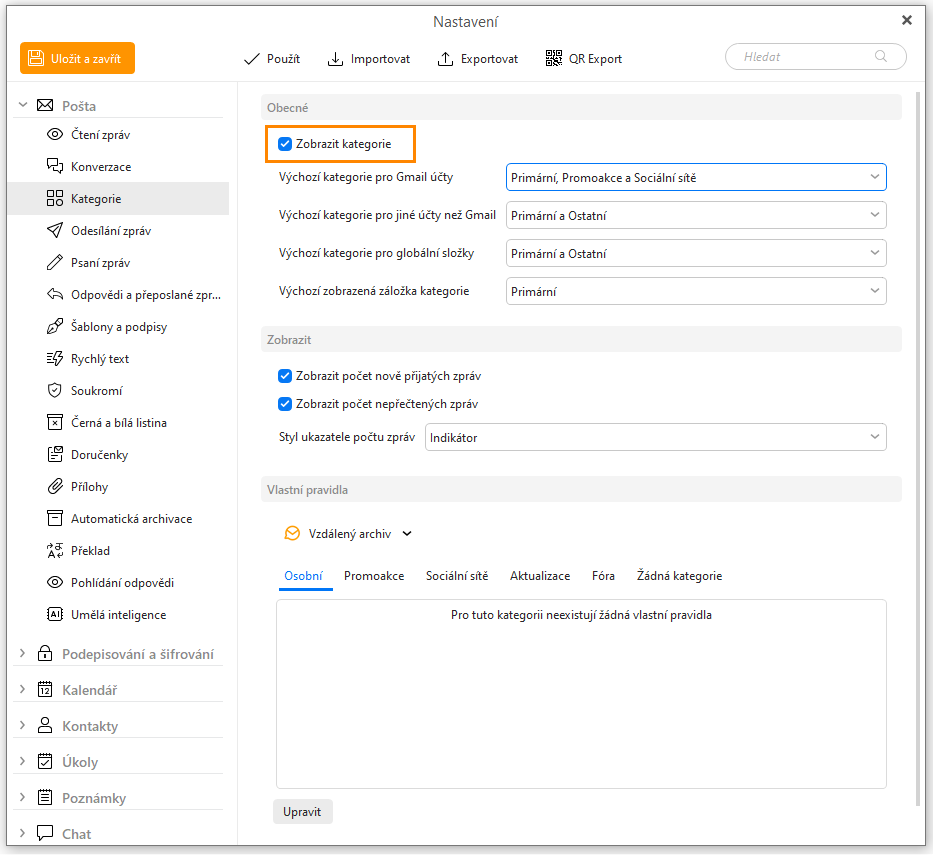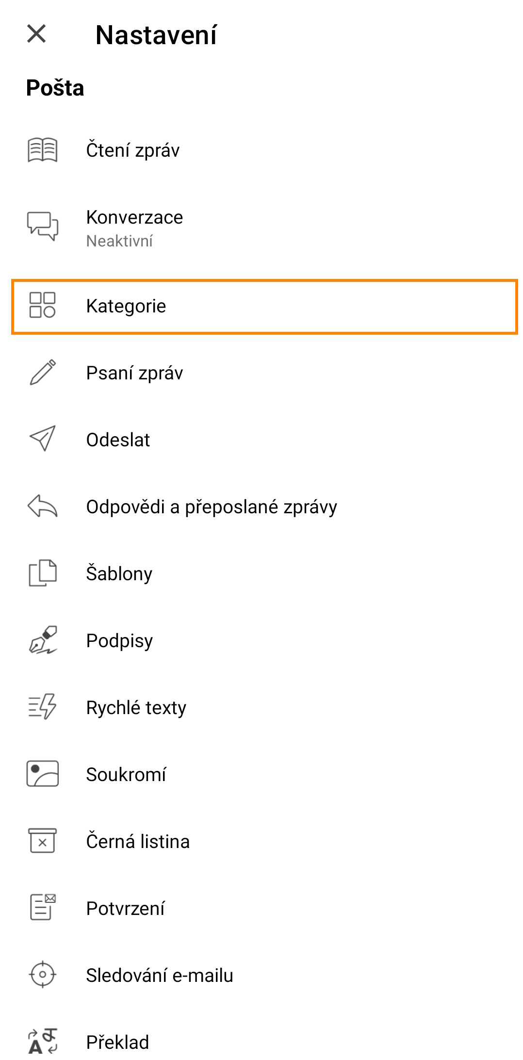 V sekci Nastavení > Pošta > Kategorie najdete všechna vlastní pravidla a nastavení kategorií na jednom místě.