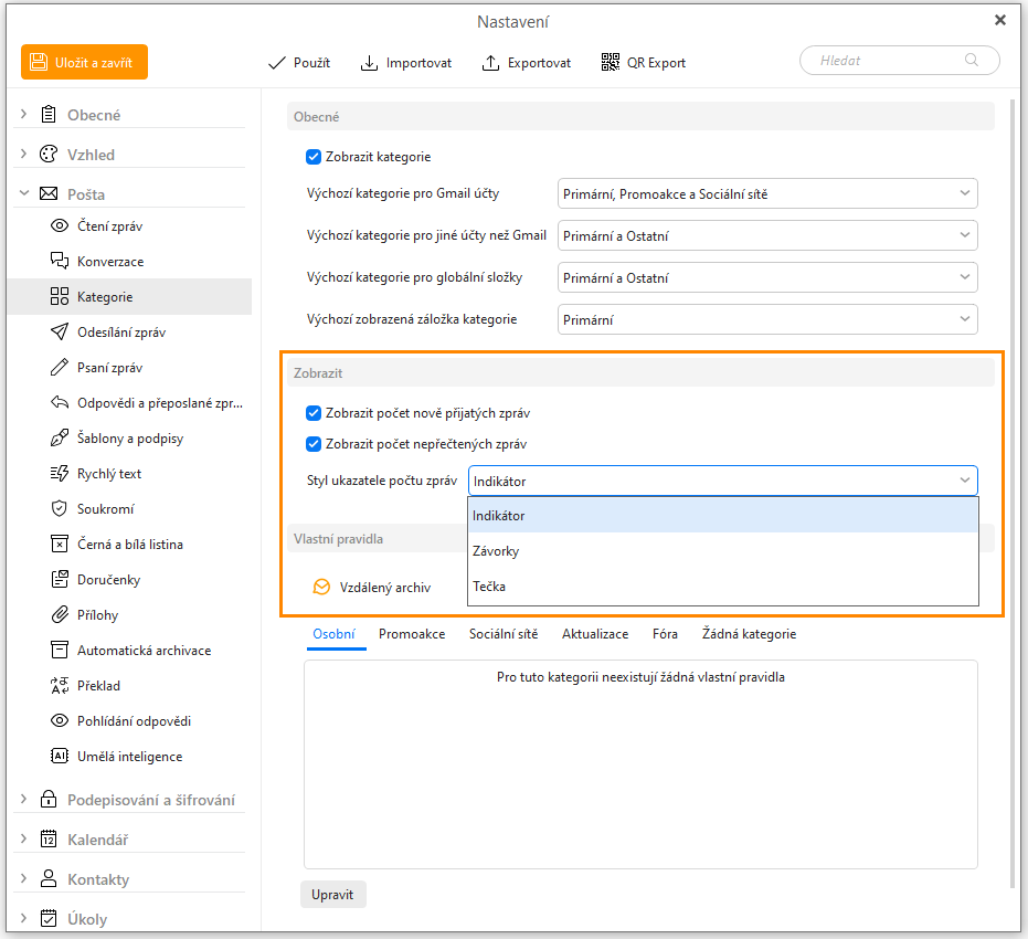 Pod nastavením zobrazení záložek najdete také možnosti zobrazení nově přijatých a nepřečtených zpráv. Můžete si zvolit, co se zobrazí vedle názvu záložky kategorie – zda počet nově přijatých zpráv, počet nepřečtených zpráv nebo ani jedna z možností.