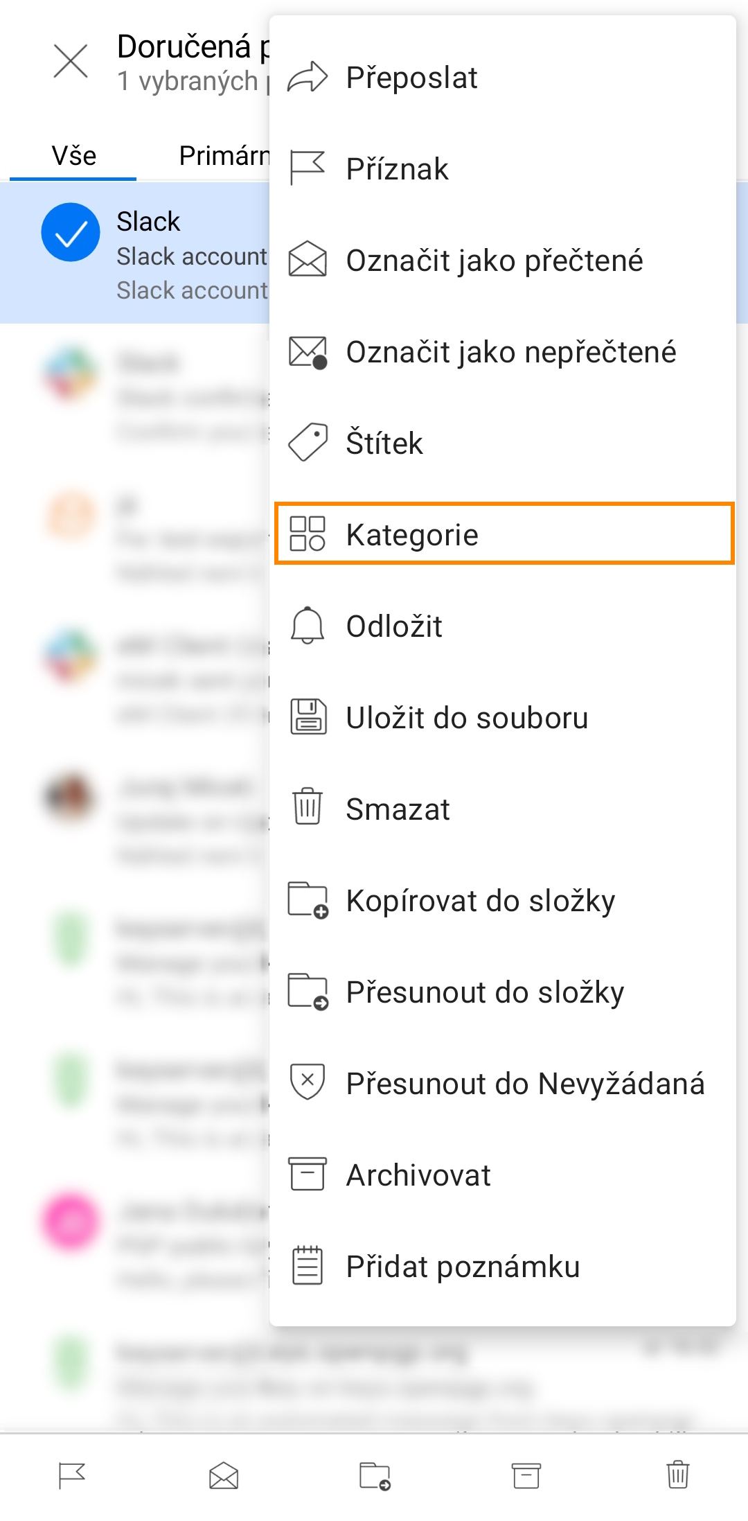 Po výběru zprávy ve složce Doručená pošta ji můžete přeřadit do jiné kategorie.