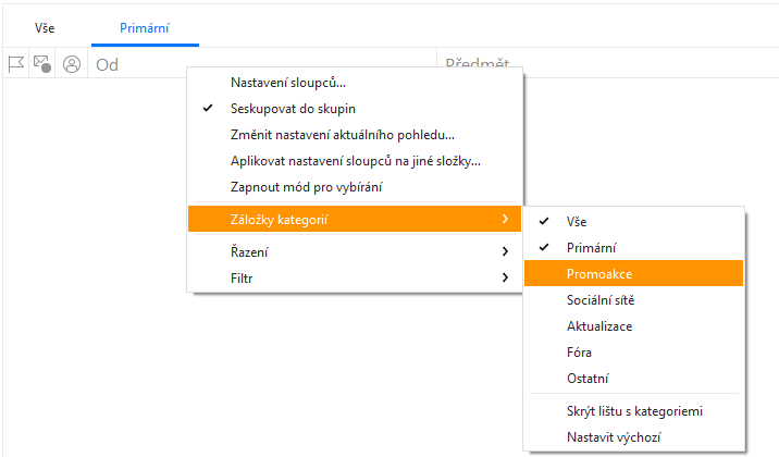 Výběr záložek kategorií lze přizpůsobit pro každý e-mailový účet. V hlavním okně klikněte pravým tlačítkem myši na záložky kategorií nebo na horní část seznamu zpráv: