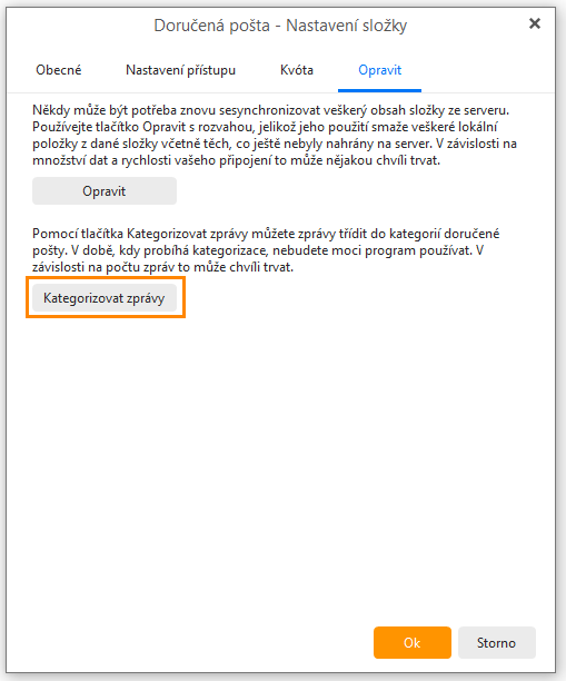 Pokud automatická kategorizace selže, zkuste použít funkci Opravit – pravým tlačítkem myši klikněte na složku Doručená pošta a vyberte Vlastnosti > Opravit > Opravit > Kategorizovat zprávy.