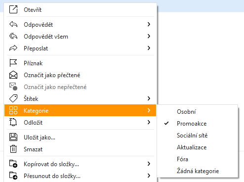 Změnu kategorie pro jednotlivé zprávy lze provést tak, že kliknete pravým tlačítkem myši na zprávu a zvolíte možnost „Kategorie“ - poté lze vybrat z dostupných kategorií: