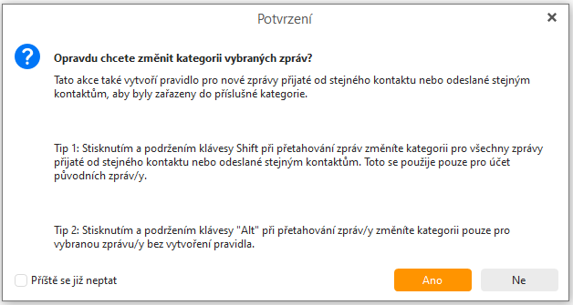 Jakmile zprávu přetáhnete na zamýšlenou záložku kategorie (nebo potvrdíte výběr kategorie u kombinovaných záložek), zobrazí se potvrzovací okno. Vysvětluje různé možnosti změny kategorie - zda se bude změna aplikovat na budoucí nebo minulé zprávy, nebo pouze na vybranou zprávu: