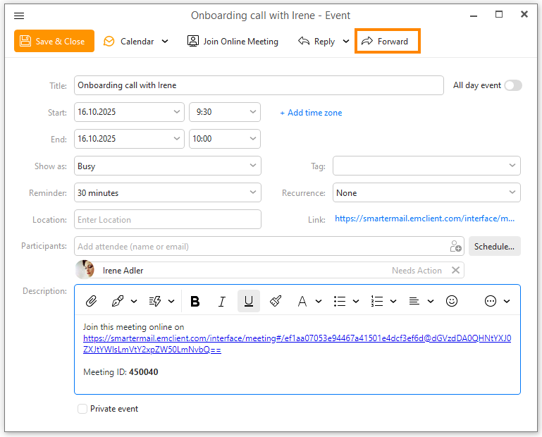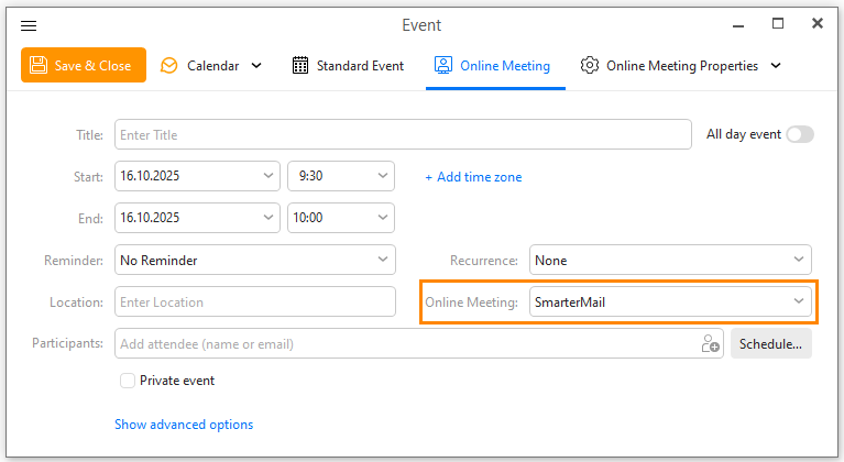 can easily create an online meeting and select SmarterMail as the provider - eM Client then automatically