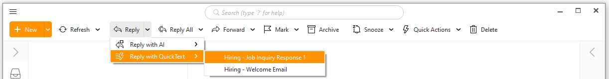 The feature is easily accessible via the Reply button's drop-down menu on both the main window toolbar and each message's Reply action button. Click the drop-down menu arrow icon and select Reply with QuickText - then you can choose which QuickText you want to use: