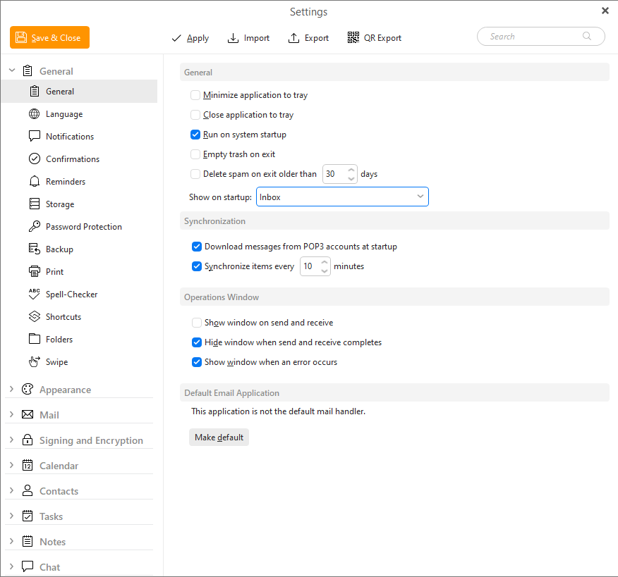 The General subsection of the general section of the Settings window contains four sub-panels: General,Synchronization, Operations Window, Default Email Application: