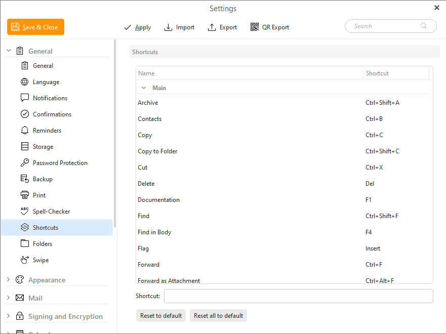 Shortcut section is divided into three subsections: Main, Mail and Send Mail.